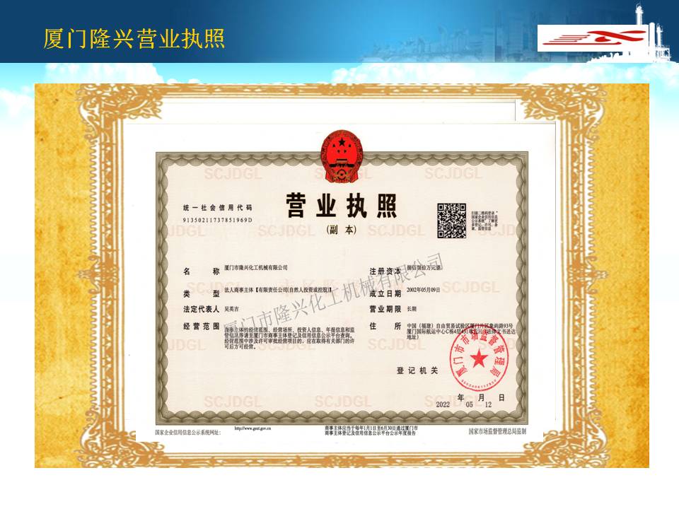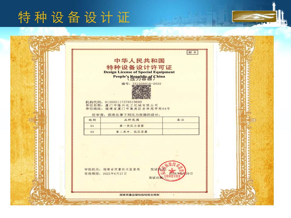 廈門隆興化工機械有限公司成立于2001年5月,占地面積30000平方米,擁有生產車間面積10000平方米及相關配套的辦公場所3000平方米,其中下料場所1000平方米,不銹鋼制作場所2000平方米,ASME產品制作區域1200平方米,無損曝光室30平方米。公司有職工135人,擁有專業的技術人員和管理人員36人。公司主要從事設計、制造A2級覆蓋D類壓力容器...